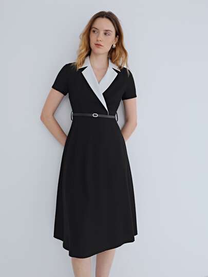 MOTF PREMIUM Vestido con cinturón viscosa de cuello en contraste - Negro - Añade 1