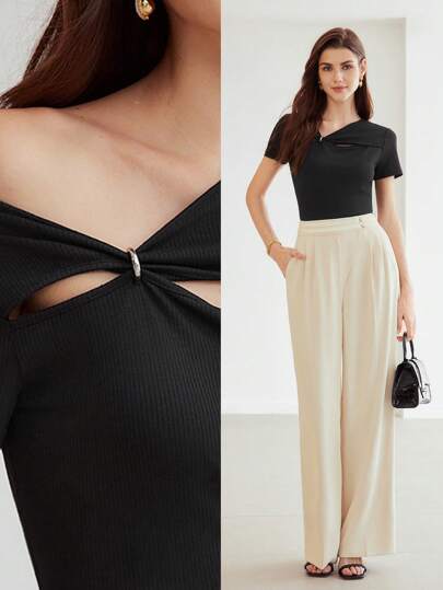 MOTF PREMIUM Camiseta Con Escote Asimétrico Para Mujer - Negro - Añade 9
