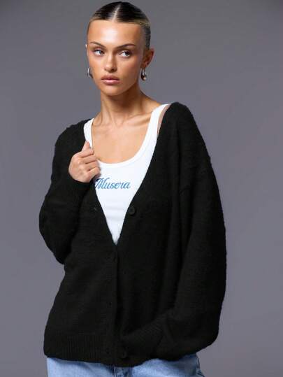 MUSERA Cárdigan de punto de mohair con botones para , estilo Y2K de los 90, informal y lindo, oversize, cómodo para el aeropuerto, casual para verano e invierno, para fiestas - Negro - Añade 5