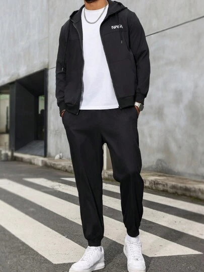 Manfinity CasualCool Conjunto de sudadera con capucha y pantalón de chándal con estampado de logo para hombres, conjunto de 2 piezas para hombres, traje de jogger para hombres, ropa de otoño - Negro - Añade 1