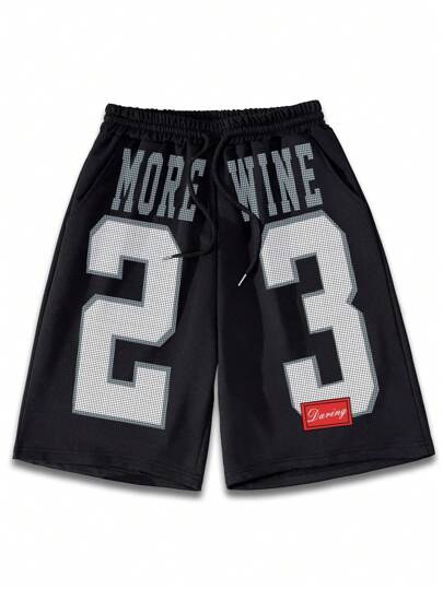 Manfinity Dauomo Pantalones cortos casuales de hombre con estampado numérico, cintura con cordón y bolsillos - Negro - Añade 4