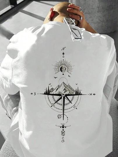 Manfinity Homme Camiseta De Hombro Caído Para Hombre Con Gráficos De Montaña Y Sol De Talla Grande - Blanco - Añade 4