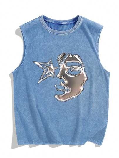 Manfinity EMRG Camiseta de tirantes informal sencilla con estampado de cara para hombres - Azul - Añade 4