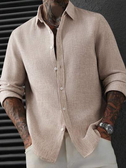 Manfinity Homme Camisa de lino de manga larga con botones delanteros de unicolor en marrón , camisa beige para hombre en color albaricoque, otoño - Caqui - Añade 1