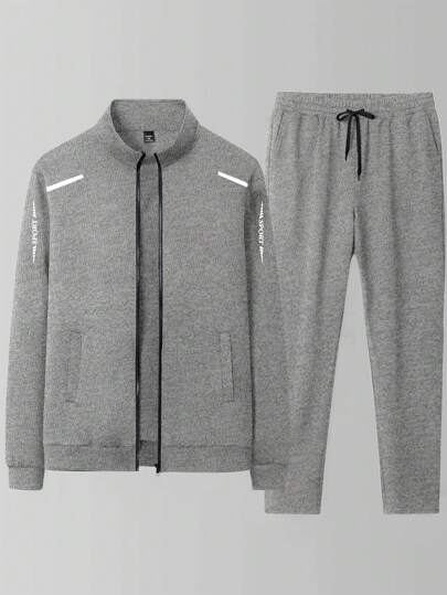 Manfinity Homme Conjunto de 2 piezas de talla grande de hombre, con top de manga larga con cremallera delantera y bolsillos, y pantalones - Gris - Añade 4