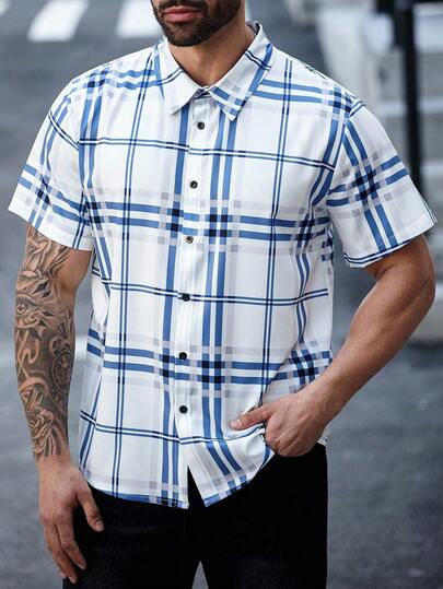 Manfinity Homme Camisa casual de manga corta con un solo pecho y cuadros para hombres de talla grande - Multicolor - Añade 1