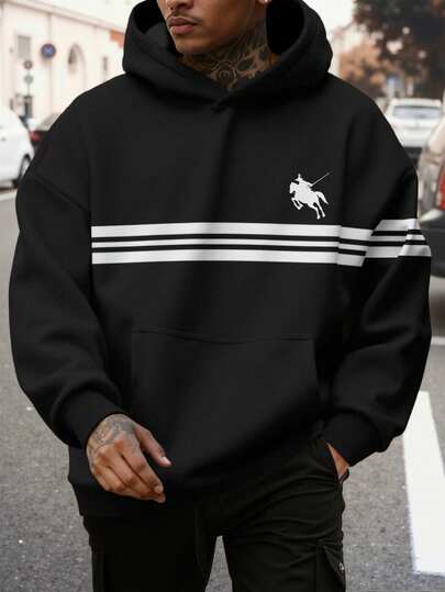 Manfinity Sudadera con capucha casual de otoño para hombres con logo de caballo y estampado a rayas, sudadera de manga larga - Negro - Añade 1