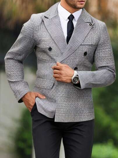 Manfinity Mode Chaqueta de traje de doble botonadura con solapa con muesca a cuadros para caballero - Blanco y Negro - Añade 4