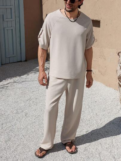 Manfinity RSRT Conjunto de camiseta de manga corta con botones y pantalones cortos casuales de vacaciones para hombres - Caqui - Añade 5