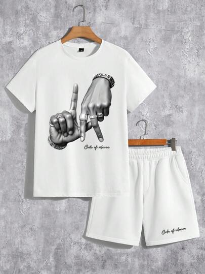 Manfinity LEGND Conjunto de Camiseta de manga corta blanca con estampado del logotipo del gesto de mano de Los Ángeles LA para hombres, estilo callejero - Blanco - Añade 1