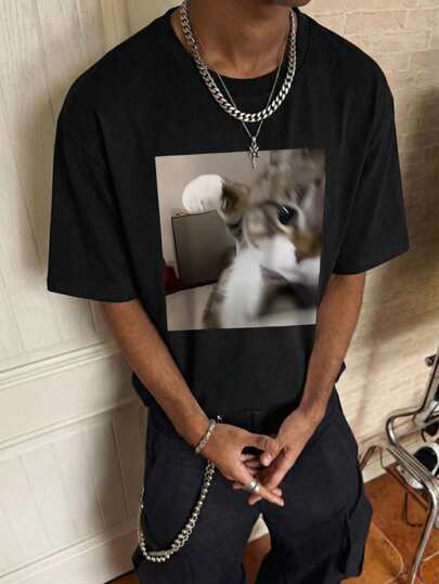 Manfinity Roghcode Camiseta de cuello redondo de manga corta con estampado de animales divertido para hombres, casual para vacaciones, cenas, citas, sencilla y versátil, adecuada para uso personal o como regalo para amigos - Negro - Añade 5