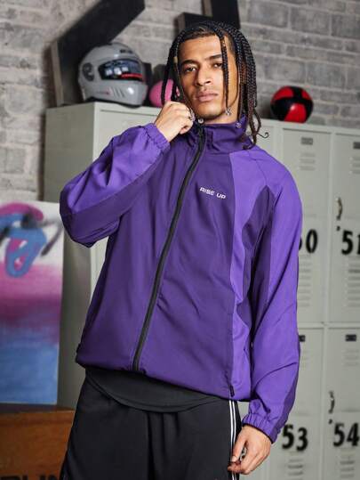 Manfinity Sport Corelite Chaqueta deportiva de estilo de novio para hombres con cierre de cremallera, de manga larga, de unicolor, con diseño de contraste de color simple y de moda, de vuelta al colegio - Morado - Añade 4