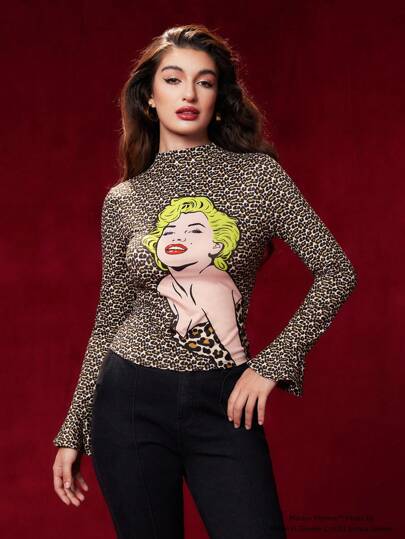 Marilyn Monroe X SHEIN Camiseta De Cuello Simulado Con Gráfico De Leopardo Y Figura - Caqui - Añade 4