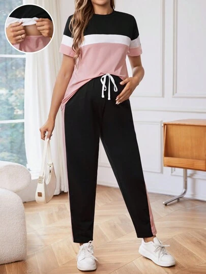 SHEIN Conjunto De Camiseta De Lactancia Para Embarazadas De Color Bloque Y Pantalones Con Cintura Ajustable - Negro - Añade 1