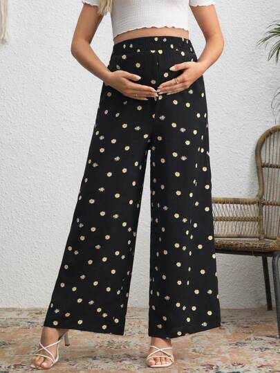 SHEIN Pantalones de maternidad de pierna ancha con estampado floral menudo - Negro - Añade 3