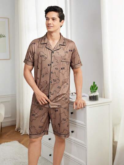 Conjunto De Traje Cómodo De Manga Corta Y Pantalones Cortos Para Hombre Con Diseño De Oso Y Cuello - Bronce - Añade 1