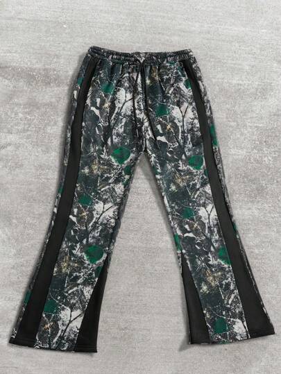 Forever 21 Pantalones deportivos casuales para hombres con diseño de estampado de ramas y hojas secas en patchwork - Negro - Añade 1