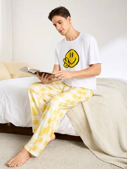 Conjunto de ropa informal para el hogar con parte superior de manga corta de cuello redondo y pantalones con estampado gráfico amarillo para hombres - Multicolor - Añade 1