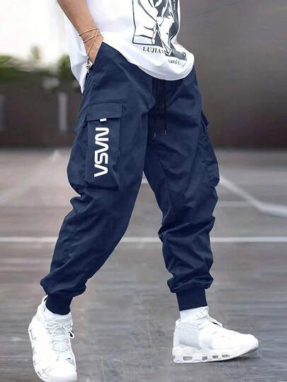 1 pieza Pantalones cargo de hombre con múltiples bolsillos, corte holgado y relajado, diseño impreso casual adecuado para la playa, uso diario, deportes y exteriores, pantalones para todas las estaciones, estilo de ropa urbana de moda, regalo perfecto para novio/esposo, otoño - Azul Marino - Añade 4
