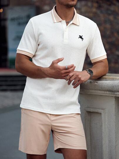 Manfinity RelaxMax Conjunto de camisa polo de manga corta casual con bordado y ribete de contraste, y shorts de un solo color para hombre - Albaricoque - Añade 5