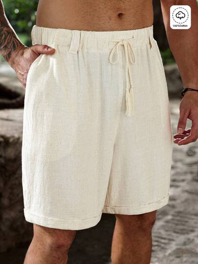 Manfinity Homme Pantalones cortos casuales sueltos de unicolor de moda para hombre, estilo bohemio de lino liso - Albaricoque - Añade 5