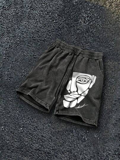 Pantalones cortos casuales de verano con estampado de figura, cordón de ajuste a la cintura para hombres - Negro - Añade 1