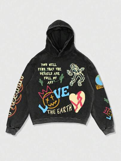 ROMWE MEN Street Life Sudadera con capucha holgada y desgastada con estampado de grafiti para hombre - Negro - Añade 1