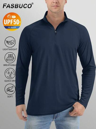 FASBUCO Men's Long Sleeve Athletic Shirts 1/4 Pullover Zip Sun Protection Rash Guard UPF 50+ Outdoor Running T-Shirts - Azul Marino - Añade 1