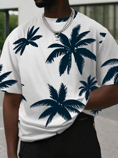 Manfinity Dauomo Camiseta casual de cuello redondo de manga corta con estampado de palmeras para hombre - Blanco - Añade 5