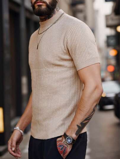 Manfinity Homme Suéter casual de punto de color liso con cuello alto y manga corta para hombre, primavera-verano - Caqui - Añade 1