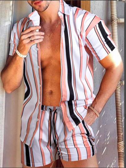Manfinity RSRT Hombres Rayas Camisa De Manga Corta Con Botones Y Pantalones Cortos - Multicolor - Añade 7