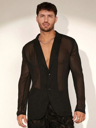 FeverCity Blazer de malla transparente y sexy para hombre en verano - Negro - Añade 2