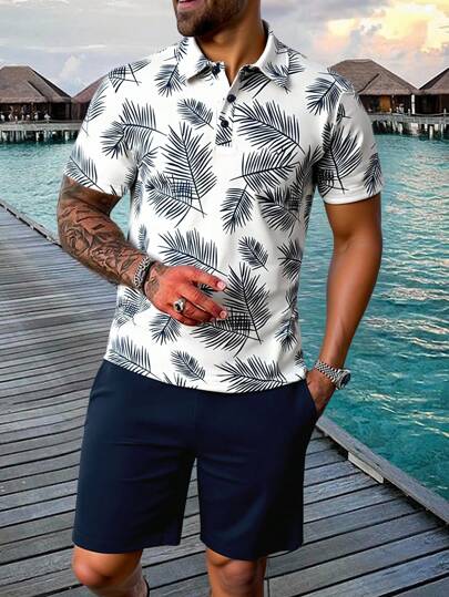 Manfinity RSRT Conjunto de polo de manga corta con estampado tropical y pantalones cortos de estilo de vacaciones de verano para hombres - azul real - Añade 2