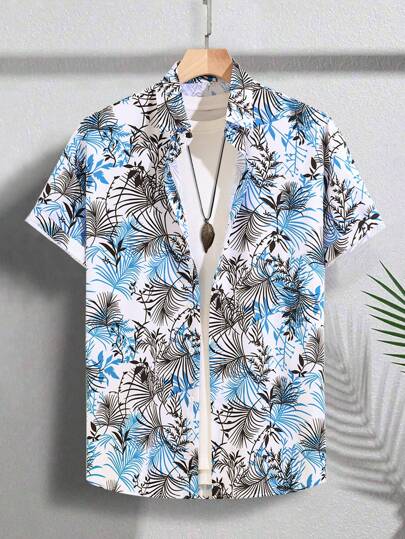 Camisa de manga corta con estampado floral tropical de una sola hilera de botones para hombre - Multicolor - Añade 1