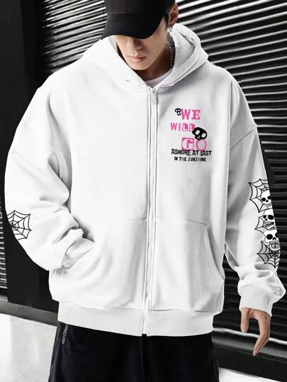 Claim Dot Hombres 1 pieza Sudadera con capucha oversize con estampado de calavera y eslogan - Blanco - Añade 6