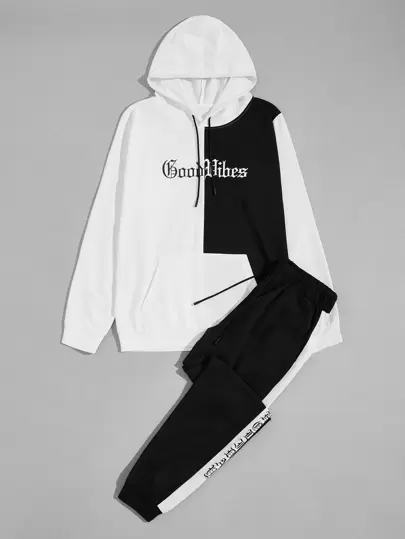 Manfinity Capucha con estampado de letra panel en contraste con pantalones deportivos - Blanco y Negro - Añade 2