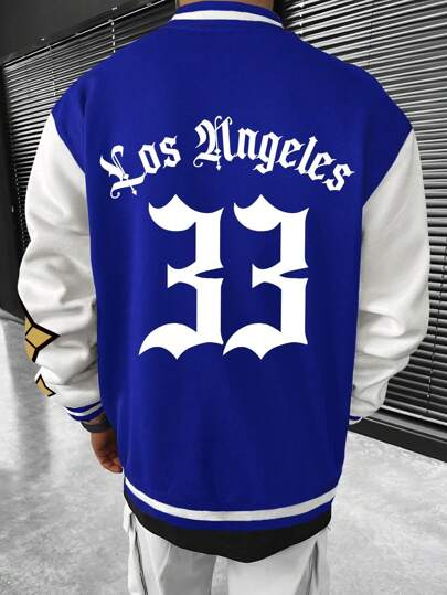 Manfinity EMRG Chaqueta Universitaria Para Hombre Con Hombros Caídos Sueltos Sin Capucha, Con Gráfico De Letras Y Detalles De Rayas - Azul y blanco - Añade 1