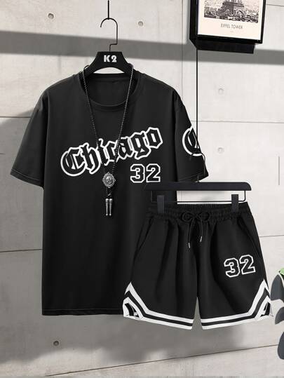 Manfinity Campus Court Hombres Camiseta con estampado de letra & Shorts ribete de rayas - Negro - Añade 3