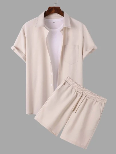 Manfinity Hombres Camisa con parche de bolsillo & Shorts de cintura con cordón sin camiseta - Albaricoque - Añade 1