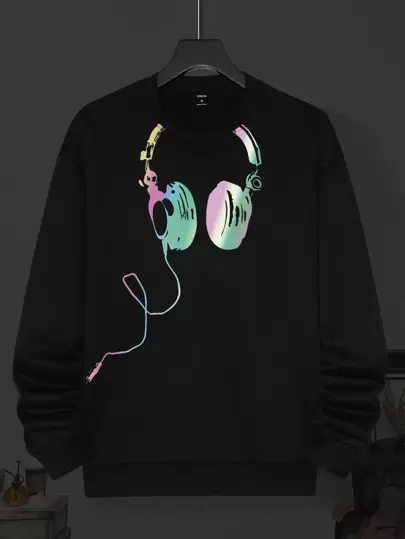Manfinity Hombres Sudadera reflectante con estampado de auricular de hombros caídos - Negro - Añade 5