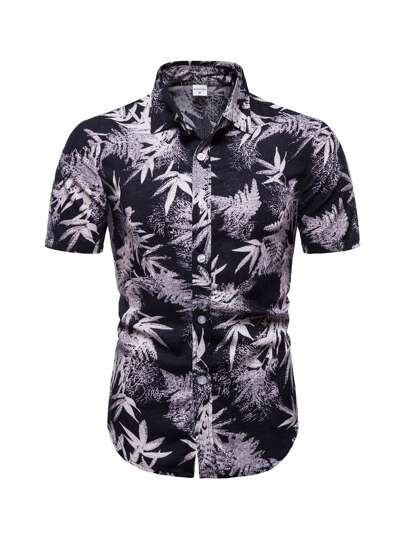 Hombres Camisa con estampado tropical con botón bajo curvo - Multicolor - Añade 1