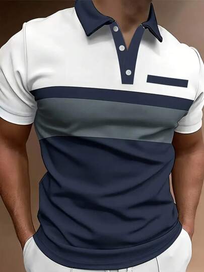 Camisa polo de manga corta con botones delanteros, de bloques de color y rayas para hombre - Multicolor - Añade 1