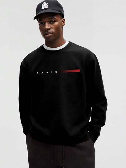 Sudadera de cuello redondo de hombre casual con estampado de letras, para primavera y otoño - Negro - Añade 1
