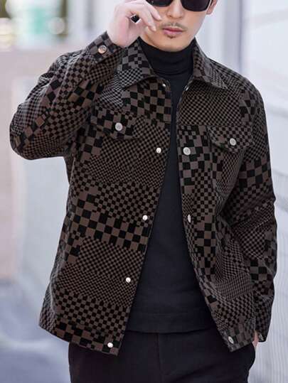 Chaqueta de cuero sintético con cuello vuelto y estampado de cuadros a cuadros para hombre, estilo de negocios, para otoño e invierno - Café integral - Añade 1