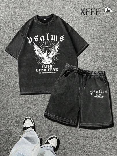 Conjunto informal de 2 piezas de camiseta de manga corta con cuello redondo y estampado de letras de música rock retro + pantalones cortos, estilo callejero de verano para hombres, algodón XFFF, lavado antiguo para uso casual - Negro - Añade 2
