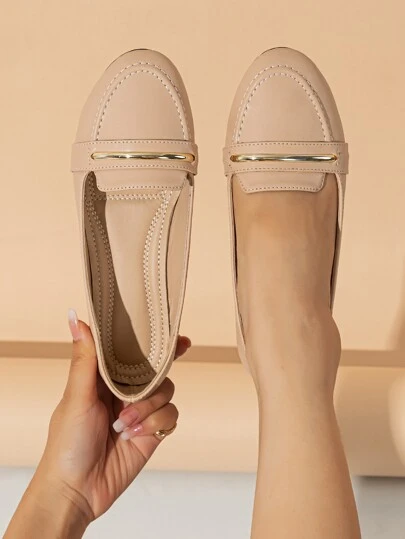 Mocasines Con Detalles Metálicos, Zapatos Planos De Ballet Redondos, Suaves Y Cómodos Con Suela Suave Y Cara Suave Para Mujeres En Temporada De Primavera Y Otoño De Color Albaricoque - Albaricoque - Añade 4