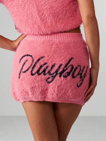 Missguided x Playboy Minifalda de punto suave con bordado de texto, cintura alta, cálida y con textura para otoño e invierno - Rosa Fucsia - Añade 1