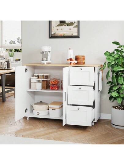 Mesa de cocinaóvil de 135 de largo * 44 de ancho * 90, encimera de madera de haya, diseño plegable, gabinete multifuncional, 3 cajones, soporte para toallas, adecuada para cocina, comedor, hogar - Blanco+Natural+MDF+Europeo - Añade 12