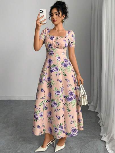 Modelyn Vestido mini elegante con estampado floral y mangas raglán, estilo de vacaciones para mujer - Rosa vieja - Añade 1