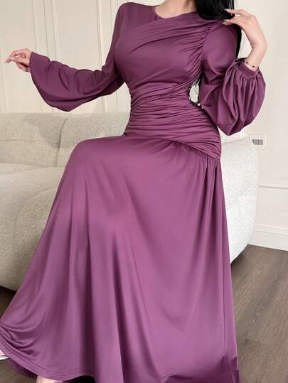Modelyn Vestido púrpura elegante de mujer con mangas de farol fruncidas de unicolor - Morado - Añade 1